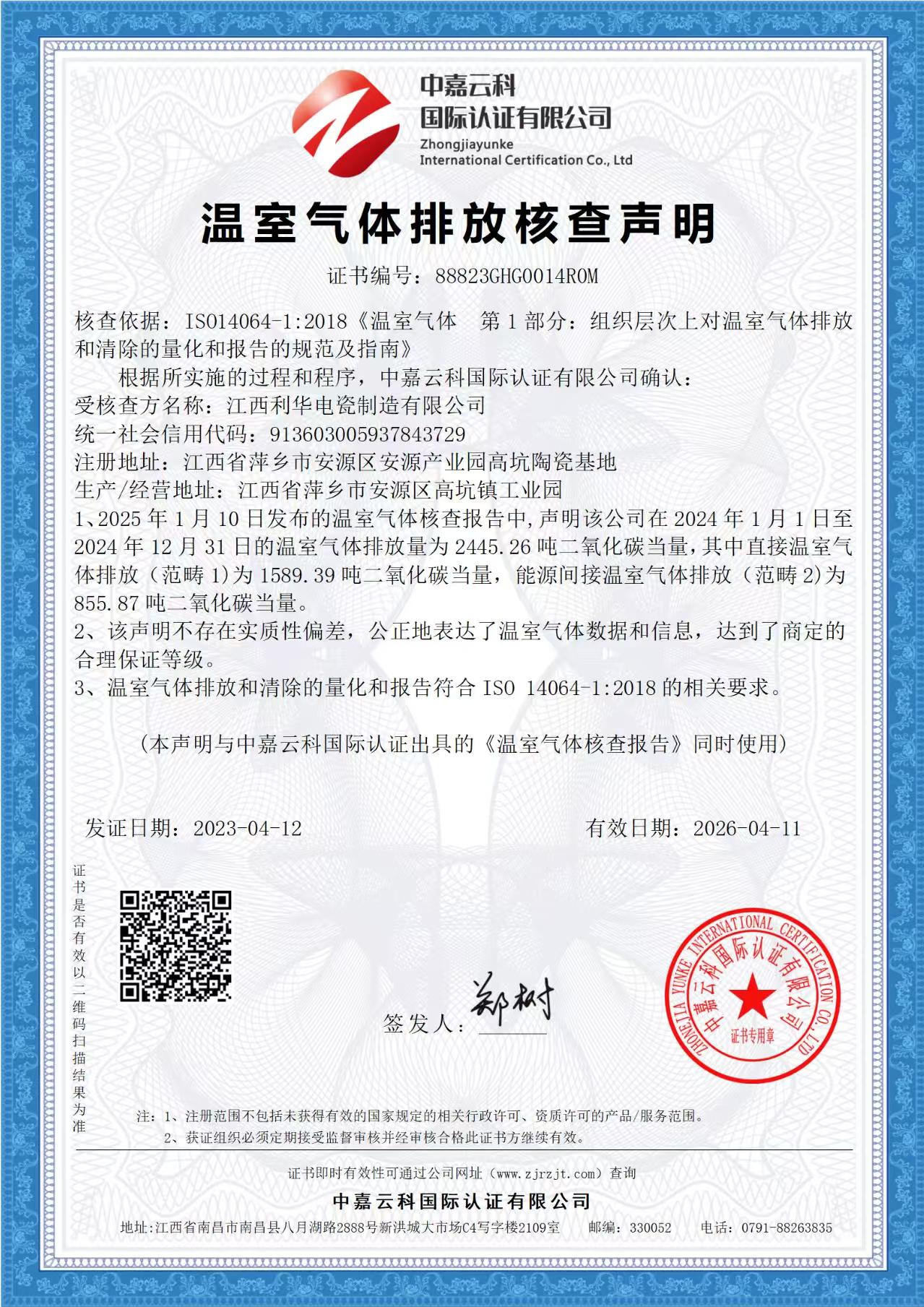温室气体排放核查声明